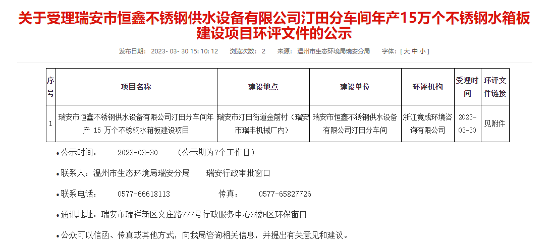 3月30日,溫州市生態環境局瑞安分局受理瑞安市恒鑫不銹鋼供水設備有限公司汀田分車間年產15萬個不銹鋼水箱板建設項目環評文件并對外進行公示,公示期為7個工作日。